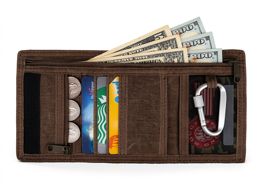 - Multi-compartment layout including zippered bill and coin pockets for organized storage